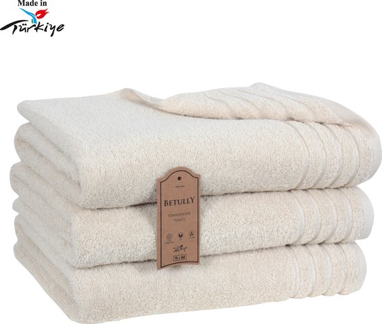 De Betully® Wadelan XL Handdoeken in beige zijn een set van 3 luxueuze badhanddoeken van hotelkwaliteit. Met een afmeting van 70x140 cm bieden ze voldoende ruimte om je helemaal in te wikkelen na een ontspannend bad of verfrissende douche. De handdoeken zijn gemaakt van 100% katoen, wat zorgt voor een zachte en comfortabele ervaring voor je huid. Deze handdoeken zijn niet alleen functioneel, maar ook stijlvol. De zware kwaliteit zorgt ervoor dat ze lang mooi blijven en goed absorberen. Daarnaast zijn ze gemakkelijk te onderhouden door ze te wassen op 40° C. Met de Betully® Wadelan XL Handdoeken geef je je badkamer een luxe uitstraling en creëer je een spa-achtige sfeer in je eigen huis.