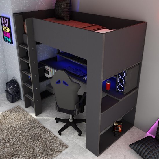 Deze stijlvolle hoogslaper combineert functionaliteit met een modern design. Het bureau biedt voldoende ruimte om te studeren of werken, terwijl de LED-verlichting zorgt voor een gezellige sfeer in de slaapkamer. De hoogslaper is gemaakt van hoogwaardige spaanplaat en is geschikt voor een matras van 90x200 cm. Het unieke ontwerp van de Hoogslaper Raven zorgt ervoor dat deze een echte eyecatcher is in elke slaapkamer. De handige opbergruimte onder het bed zorgt ervoor dat je spullen netjes opgeborgen kunnen worden. Daarnaast is de hoogslaper eenvoudig in elkaar te zetten en is het een duurzame keuze voor elke tienerkamer. Met de Hoogslaper Raven haal je niet alleen een praktisch meubelstuk in huis, maar ook een stijlvolle toevoeging aan je interieur.