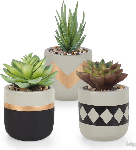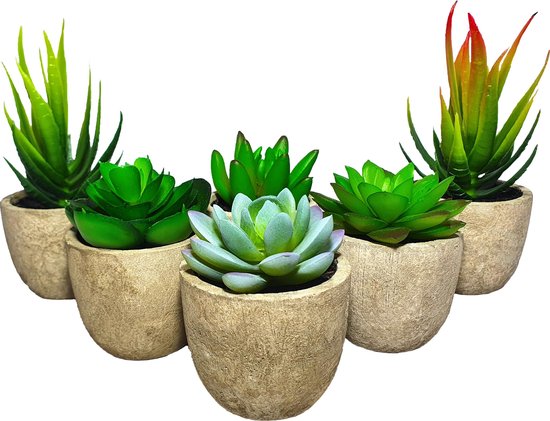 De kleine vetplantjes zijn perfect om wat groen toe te voegen aan elke kamer zonder gedoe met water geven of zorgen over zonlicht. De stenen potten geven de plantjes een natuurlijke uitstraling en passen goed bij elk interieur. Deze set van kunstplanten is ideaal voor een housewarming cadeau of gewoon om je eigen huis op te fleuren. De mini vetplantjes hebben een hoogte van 13 tot 15 cm en zijn gemakkelijk te verplaatsen naar elke gewenste plek in huis. Voeg een vleugje natuur toe aan je interieur met deze schattige en onderhoudsvrije kunstplanten.