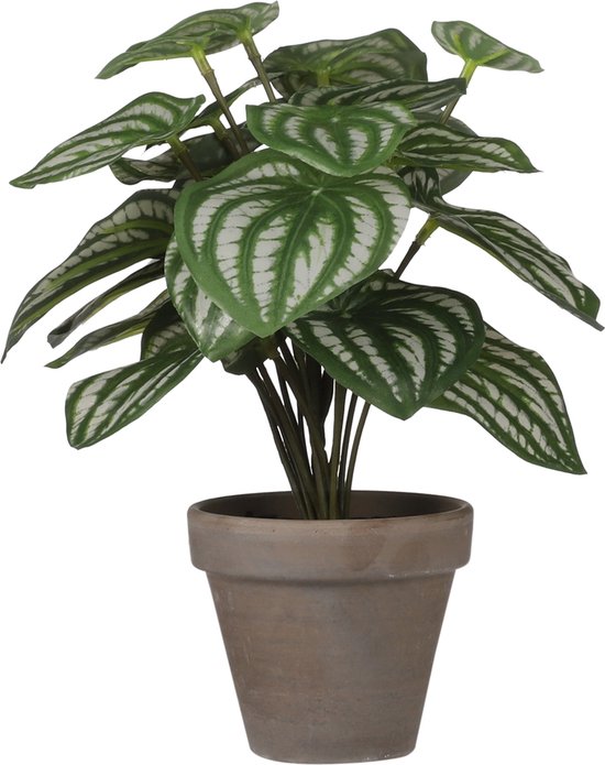 De Mica Peperomia lichtin pot Stan is een perfecte keuze voor iedereen die op zoek is naar een onderhoudsvrije en toch prachtige plant voor in huis. De gedetailleerde en realistische uitstraling van deze kunstplant maakt hem een waardevolle toevoeging aan elk interieur. De lichtgroene bladeren met hun bonte tekening zorgen voor een levendige en natuurlijke uitstraling, zonder dat je je zorgen hoeft te maken over water geven of verzorging. De Peperomia is al stevig verankerd in een terracotta pot met basalt grijze pigmenten, waardoor hij direct neergezet kan worden. Met een hoogte van 24 cm en een diameter van 23 cm is deze plant perfect voor op een tafel, kast of vensterbank. Creëer een groene oase in huis door de Peperomia te combineren met andere kunstplanten en -bloemen uit de Mica Decorations collectie. Zo breng je op een eenvoudige manier meer natuur in huis, zonder gedoe met water geven en verzorging.
