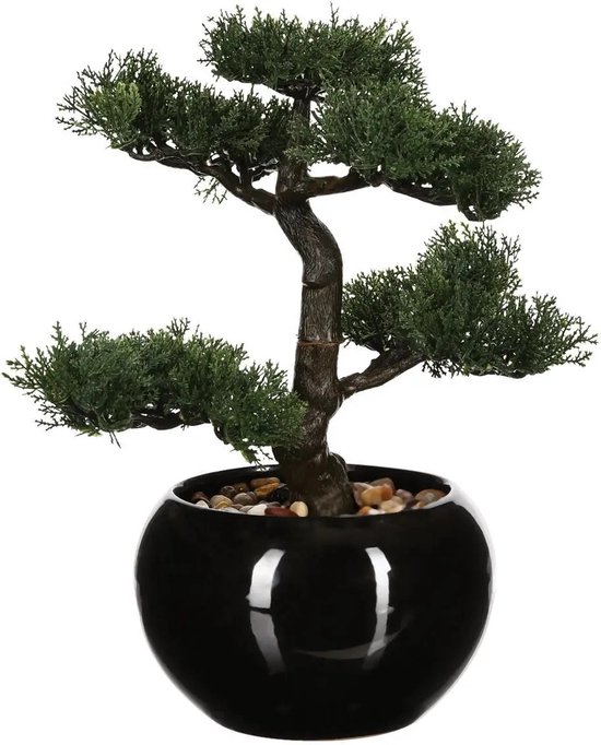 De Atmosphera bonsai in keramische pot is de perfecte aanvulling op elk interieur. Met een hoogte van ongeveer 36 cm zorgt deze realistisch uitziende kunstplant voor een vleugje groen in huis, zonder gedoe met water geven of verzorgen. De keramische pot geeft een moderne en stijlvolle uitstraling aan de bonsai en past goed bij verschillende interieurstijlen. De kunstplant is gemaakt van hoogwaardig kunststof en de pot van stevig keramiek. De afmetingen van de pot zijn ongeveer D16 x H11 cm, waardoor deze perfect op een tafel, plank of vensterbank past. Deze bonsai is een eyecatcher in elke ruimte en voegt een vleugje natuurlijke schoonheid toe. Let op: omdat elke bonsai met de hand wordt gemaakt, kan de kleur en vorm enigszins variëren van de afbeelding, wat elk stuk uniek maakt. Perfect voor het toevoegen van groen aan je interieur zonder gedoe, deze Atmosphera bonsai is een must-have voor elke plantenliefhebber.