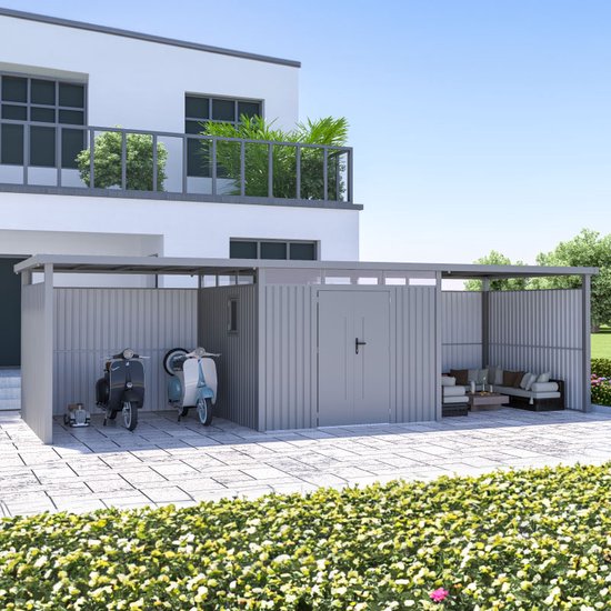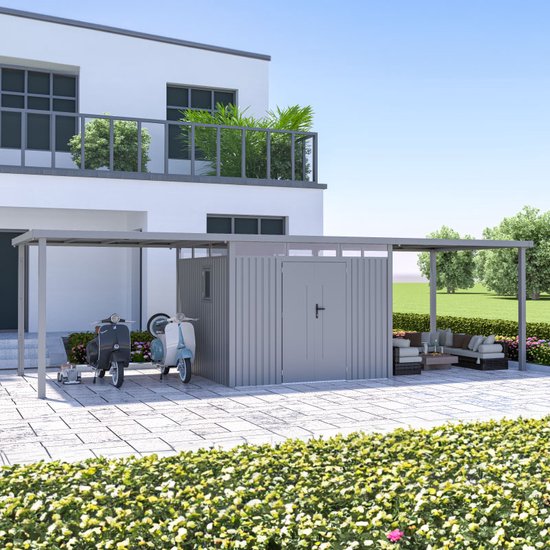Met een centraal slot en een regenpijp is dit metalen tuinhuis niet alleen stijlvol, maar ook zeer functioneel. Het centrale slot zorgt voor extra veiligheid, terwijl de regenpijp ervoor zorgt dat het water netjes wordt afgevoerd. Daarnaast heeft de Lagos 300 een ruime overkapping waar je heerlijk kunt ontspannen en genieten van het buitenleven, zelfs als het regent. Dit tuinhuis is gemaakt van hoogwaardig metaal en is daardoor zeer duurzaam en onderhoudsvriendelijk. De strakke en moderne uitstraling past perfect bij elke tuininrichting en zal zeker de aandacht trekken. Of je nu op zoek bent naar extra opbergruimte of een gezellige plek om te relaxen, de Rockford Lagos 300 is de ideale keuze voor jouw tuin. Bestel nu en geniet binnenkort van jouw eigen stijlvolle en praktische tuinhuis met overkappingen!