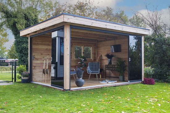 De blokhut heeft een afmeting van 300x300cm en beschikt over een overkapping van 150cm, perfect voor het creëren van een gezellige buitenruimte. De luifel zorgt voor extra beschutting en biedt de mogelijkheid om ook bij slechter weer buiten te genieten. Dankzij de behandeling van het hout is de blokhut beschermd tegen verschillende weersinvloeden en gaat deze langer mee. De moderne uitstraling past perfect in elke tuin en biedt voldoende ruimte voor het opbergen van tuingereedschap of het inrichten als knusse loungeplek. Met deze blokhut met overkapping en luifel haal je niet alleen een praktisch, maar ook een stijlvol tuinelement in huis.